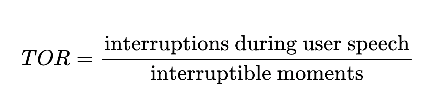 Lower TOR usually means more polite turn-taking. But you don’t want zero: people overlap a bit in natural conversation, so TOR is often compared to human baselines rather than driven to zero.